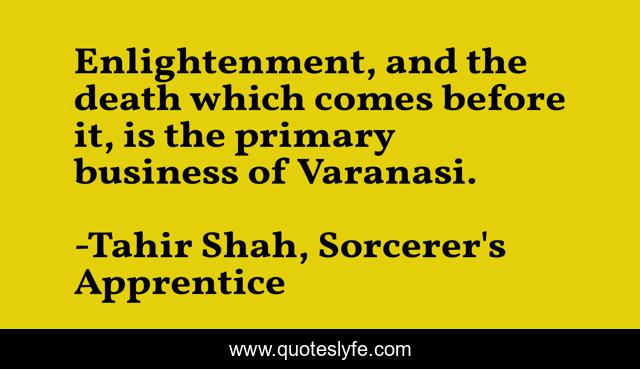This page presents the quote "Enlightenment, and the death which comes before it, is the primary business of Varanasi.". Author of this quote is Tahir Shah, Sorcerer's Apprentice. This quote is about death, travel, enlightenment, india, varanasi,.