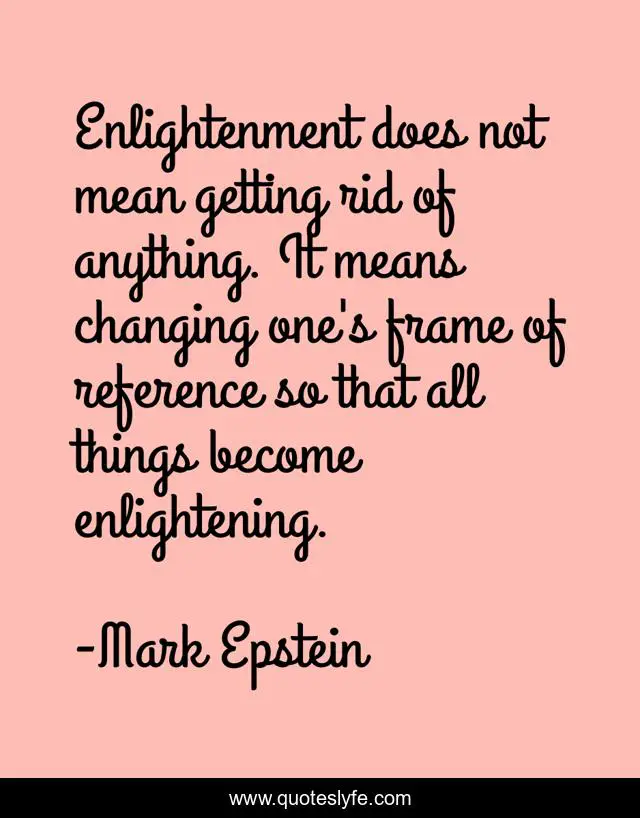 This page presents the quote "Enlightenment does not mean getting rid of anything. It means changing one's frame of reference so that all things become enlightening.". Author of this quote is Mark Epstein. This quote is about buddhism, enlightenment,.