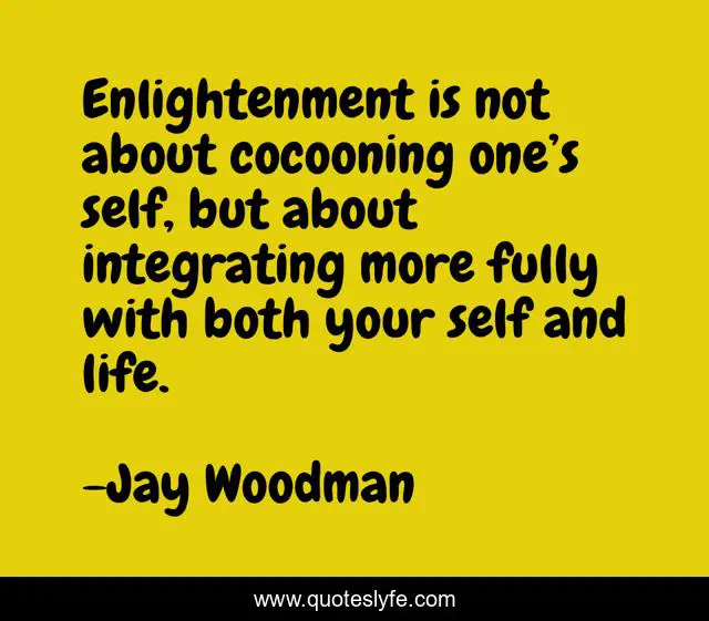 This page presents the quote "Enlightenment is not about cocooning one’s self, but about integrating more fully with both your self and life.". Author of this quote is Jay Woodman. This quote is about life, self-confidence, enlightening, integrating, life-lesson, self, integration, life-philosophy, self-realization,.