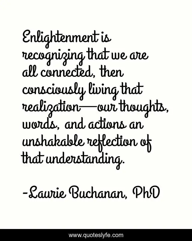 This page presents the quote "Enlightenment is recognizing that we are all connected, then consciously living that realization—our thoughts, words, and actions an unshakable reflection of that understanding.". Author of this quote is Laurie Buchanan, PhD. .