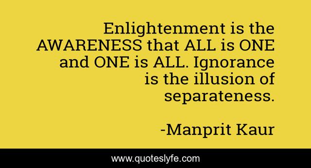 This page presents the quote "Enlightenment is the AWARENESS that ALL is ONE and ONE is ALL. Ignorance is the illusion of separateness.". Author of this quote is Manprit Kaur. This quote is about all, god, ignorance, oneness, separateness, enlightenment, illusion, awareness,.