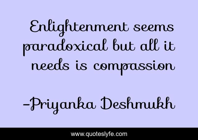 This page presents the quote "Enlightenment seems paradoxical but all it needs is compassion". Author of this quote is Priyanka Deshmukh. This quote is about compassion, spiritual, enlightenment,.