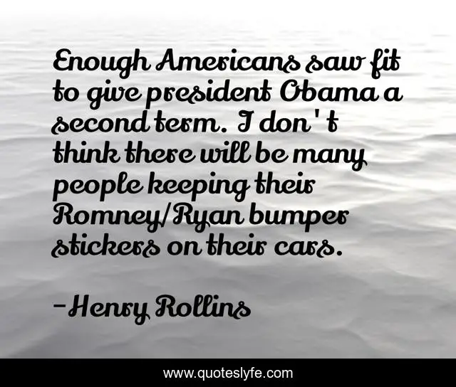 This page presents the quote "Enough Americans saw fit to give president Obama a second term. I don't think there will be many people keeping their Romney/Ryan bumper stickers on their cars.". Author of this quote is Henry Rollins. This quote is about president, think, people,.