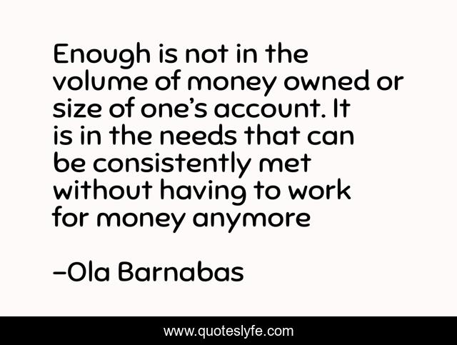 This page presents the quote "Enough is not in the volume of money owned or size of one’s account. It is in the needs that can be consistently met without having to work for money anymore". Author of this quote is Ola Barnabas. This quote is about inspirational-attitude, life-philosophy, personal-development, finance,.