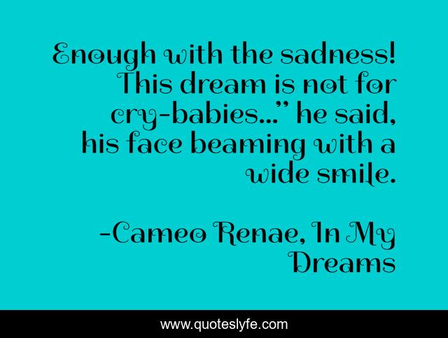 This page presents the quote "Enough with the sadness! This dream is not for cry-babies...” he said, his face beaming with a wide smile.". Author of this quote is Cameo Renae, In My Dreams. This quote is about romance, young-adult-fiction, supernatural, thriller,.