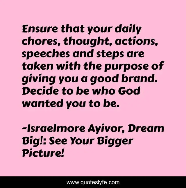 "Israelmore Ayivor, Dream Big!: See Your Bigger Picture! Quotes." Quoteslyfe.com, 2025. Fri. 05 Dec. 2025. <https://www.quoteslyfe.com/quote/Ensure-that-your-daily-chores-thought-actions-129477>.