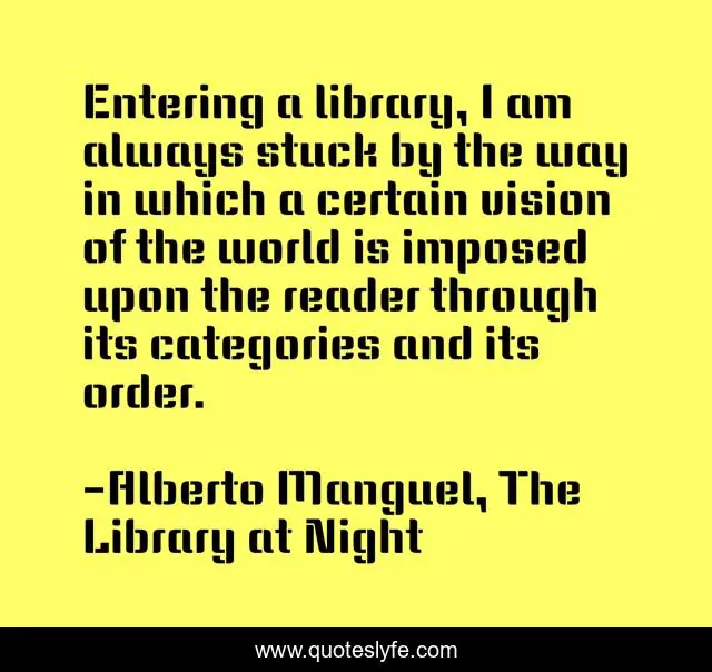 This page presents the quote "Entering a library, I am always stuck by the way in which a certain vision of the world is imposed upon the reader through its categories and its order.". Author of this quote is Alberto Manguel, The Library at Night. This quote is about libraries, library,.