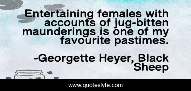 This page presents the quote "Entertaining females with accounts of jug-bitten maunderings is one of my favourite pastimes.". Author of this quote is Georgette Heyer, Black Sheep. This quote is about regency, sarcasm,.