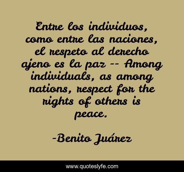 This page presents the quote "Entre los individuos, como entre las naciones, el respeto al derecho ajeno es la paz -- Among individuals, as among nations, respect for the rights of others is peace.". Author of this quote is Benito Juárez. This quote is about politics, inspirational, enthusiasm,.