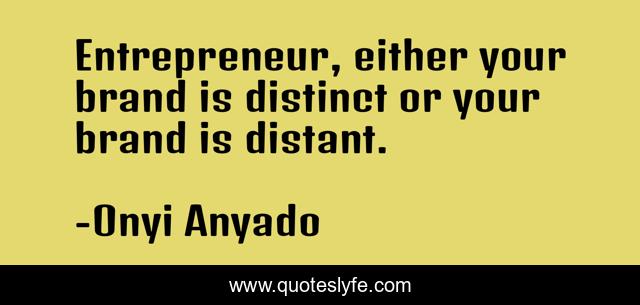 This page presents the quote "Entrepreneur, either your brand is distinct or your brand is distant.". Author of this quote is Onyi Anyado. This quote is about apple, branding, brand, entrepreneurship, entrepreneur, richard-branson, leadership, quote-of-the-day, quotes-to-live-by,.