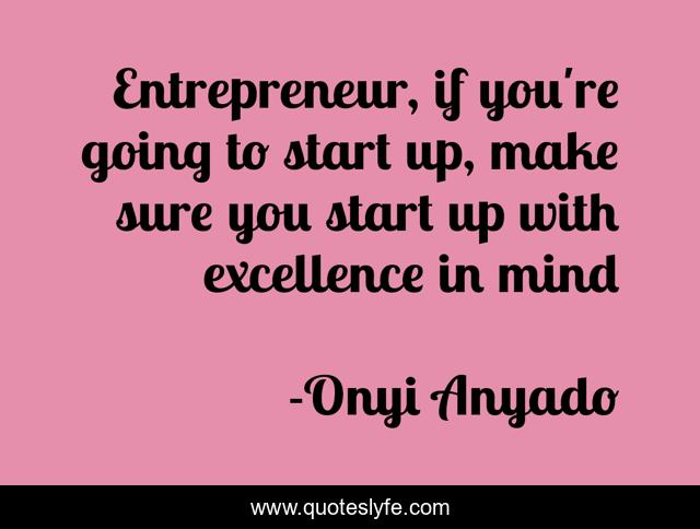 This page presents the quote "Entrepreneur, if you're going to start up, make sure you start up with excellence in mind". Author of this quote is Onyi Anyado. This quote is about business, business-leaders, quotes-to-make-you-think, startup, entrepreneurship, quotes, leadership, excellence, innovation,.