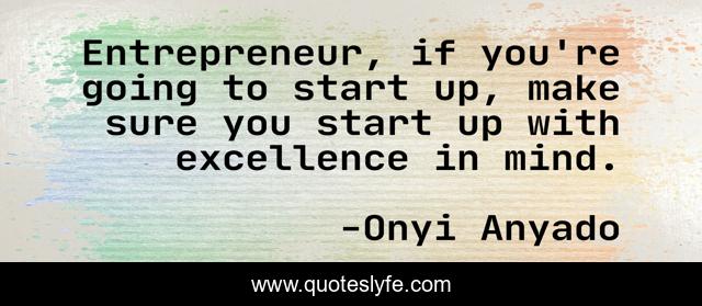 This page presents the quote "Entrepreneur, if you're going to start up, make sure you start up with excellence in mind.". Author of this quote is Onyi Anyado. This quote is about start-up, startup, entrepreneurship, entrepreneur, onyi-anyado, distinction, startups, the-doorway-to-distinction,.