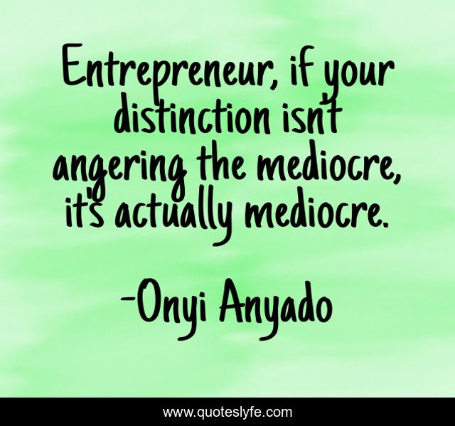 This page presents the quote "Entrepreneur, if your distinction isn't angering the mediocre, it's actually mediocre.". Author of this quote is Onyi Anyado. This quote is about business, quote-of-the-day, entrepreneurship, entrepreneur, entrepreneurial, stay-focused, onyi-anyado, distinction, quotes-to-live-by,.