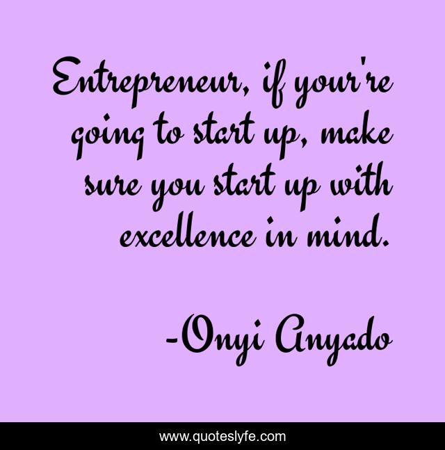 This page presents the quote "Entrepreneur, if your're going to start up, make sure you start up with excellence in mind.". Author of this quote is Onyi Anyado. This quote is about business-advice, business, entrepreneur, quote-of-the-day, startup, entrepreneurial, entrepreneurship, quotes, richard-branson,.