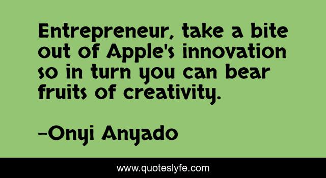 This page presents the quote "Entrepreneur, take a bite out of Apple's innovation so in turn you can bear fruits of creativity.". Author of this quote is Onyi Anyado. This quote is about steve-jobs, apple-computer-inc, apple, business, creativity, entrepreneurship, entrepreneur, leadership, onyi-anyado,.