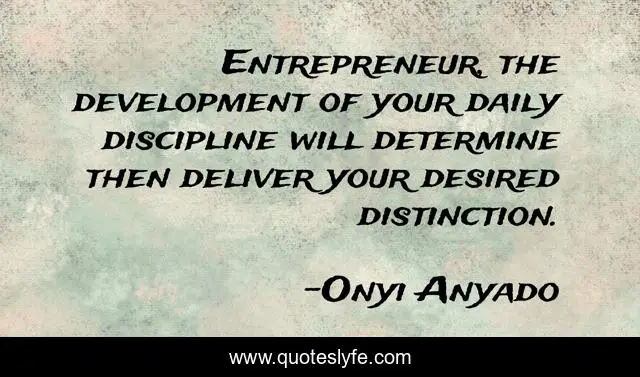 This page presents the quote "Entrepreneur, the development of your daily discipline will determine then deliver your desired distinction.". Author of this quote is Onyi Anyado. This quote is about development, discipline, personal-growth, developing-leadership-skills, entrepreneurship, entrepreneur, goals, quotes-about-life, personal-development,.
