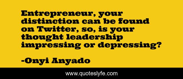 This page presents the quote "Entrepreneur, your distinction can be found on Twitter, so, is your thought leadership impressing or depressing?". Author of this quote is Onyi Anyado. This quote is about twitter-advice, social-media, thought-leadership, thought-leaders, entrepreneur, quote-of-the-day, twitter, quotes-to-make-you-think, entrepreneurship,.