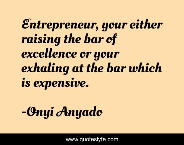 This page presents the quote "Entrepreneur, your either raising the bar of excellence or your exhaling at the bar which is expensive.". Author of this quote is Onyi Anyado. This quote is about business, leadership-development, quotes-to-make-you-think, entrepreneurship, entrepreneur, richard-branson, leadership, excellence, onyi-anyado,.