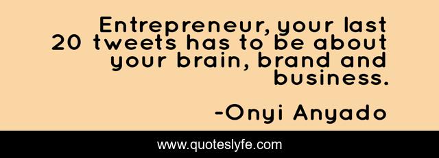 This page presents the quote "Entrepreneur, your last 20 tweets has to be about your brain, brand and business.". Author of this quote is Onyi Anyado. This quote is about social-media, business, branding, twitter, start-up, entrepreneurship, entrepreneur, distinction, start-ups,.