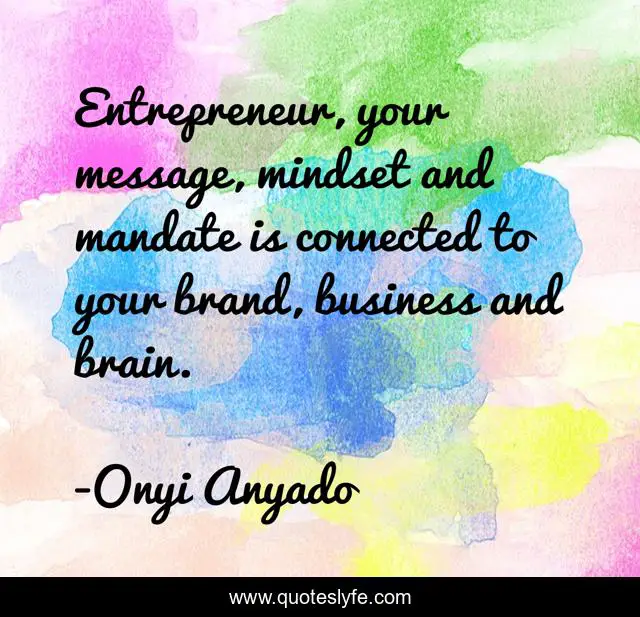This page presents the quote "Entrepreneur, your message, mindset and mandate is connected to your brand, business and brain.". Author of this quote is Onyi Anyado. This quote is about brainy, business-advice, business, brain, branding, brand, mandate, entrepreneurship, entrepreneur,.