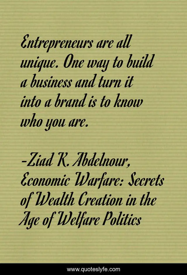 This page presents the quote "Entrepreneurs are all unique. One way to build a business and turn it into a brand is to know who you are.". Author of this quote is Ziad K. Abdelnour, Economic Warfare: Secrets of Wealth Creation in the Age of Welfare Politics. This quote is about entrepreneur, brand, business,.