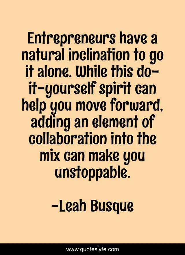 This page presents the quote "Entrepreneurs have a natural inclination to go it alone. While this do-it-yourself spirit can help you move forward, adding an element of collaboration into the mix can make you unstoppable.". Author of this quote is Leah Busque. This quote is about collaboration, help,.