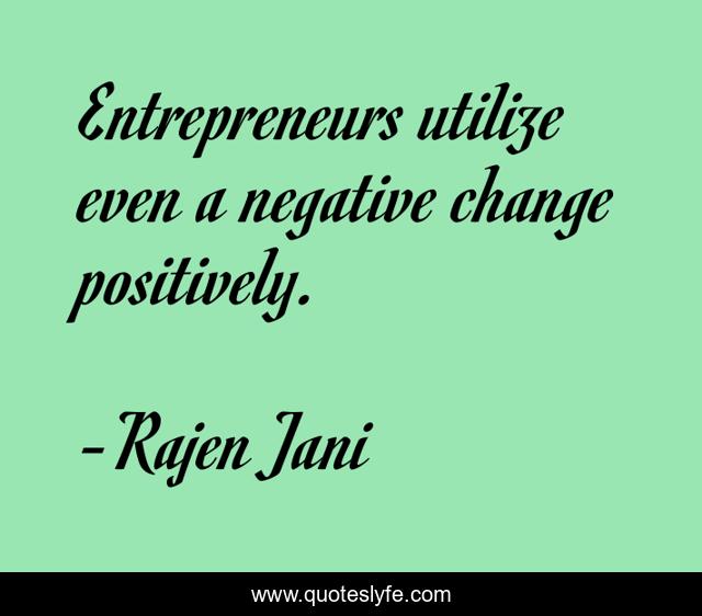 This page presents the quote "Entrepreneurs utilize even a negative change positively.". Author of this quote is Rajen Jani. This quote is about motivation, communication, sales, anger, improvement, quality, management, knowledge, strategy,.