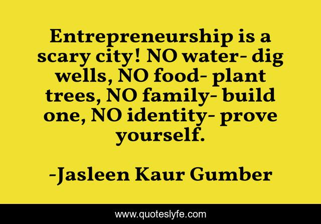 This page presents the quote "Entrepreneurship is a scary city! NO water- dig wells, NO food- plant trees, NO family- build one, NO identity- prove yourself.". Author of this quote is Jasleen Kaur Gumber. This quote is about startups, startup, entrepreneurship,.