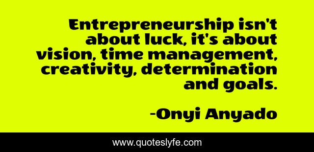 This page presents the quote "Entrepreneurship isn't about luck, it's about vision, time management, creativity, determination and goals.". Author of this quote is Onyi Anyado. This quote is about time-management, creativity, lucky, entrepreneurship, entrepreneur, determination, onyi-anyado, luck, vision,.