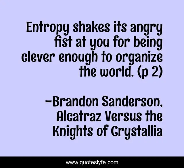 "Brandon Sanderson, Alcatraz Versus the Knights of Crystallia Quotes." Quoteslyfe.com, 2025. Fri. 05 Dec. 2025. <https://www.quoteslyfe.com/quote/Entropy-shakes-its-angry-fist-at-you-240536>.