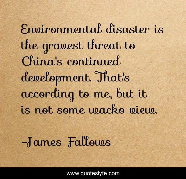 This page presents the quote "Environmental disaster is the gravest threat to China's continued development. That's according to me, but it is not some wacko view.". Author of this quote is James Fallows. This quote is about me, development, view,.