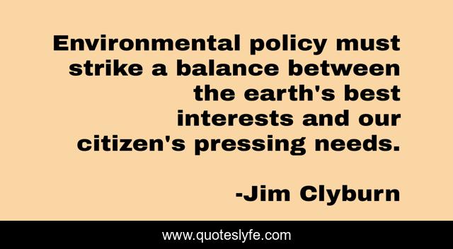This page presents the quote "Environmental policy must strike a balance between the earth's best interests and our citizen's pressing needs.". Author of this quote is Jim Clyburn. This quote is about earth, balance, best,.