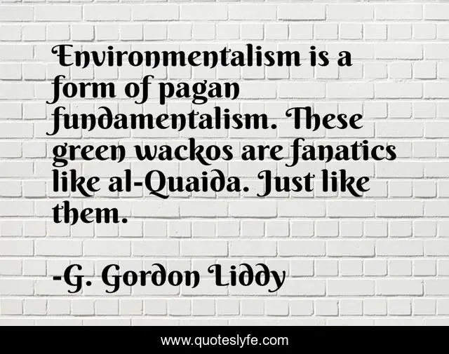 This page presents the quote "Environmentalism is a form of pagan fundamentalism. These green wackos are fanatics like al-Quaida. Just like them.". Author of this quote is G. Gordon Liddy. This quote is about green, like, just,.