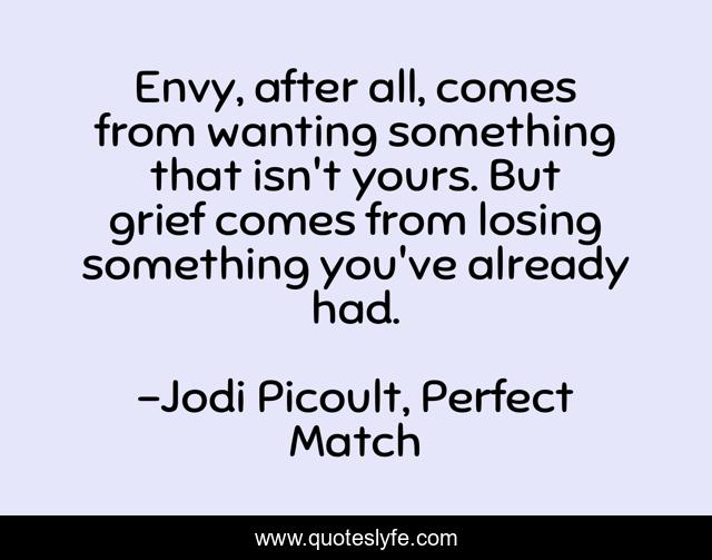 This page presents the quote "Envy, after all, comes from wanting something that isn't yours. But grief comes from losing something you've already had.". Author of this quote is Jodi Picoult, Perfect Match. This quote is about ethical, envy, ran, life, perfect-match, grief, moral, jodi-picoult,.