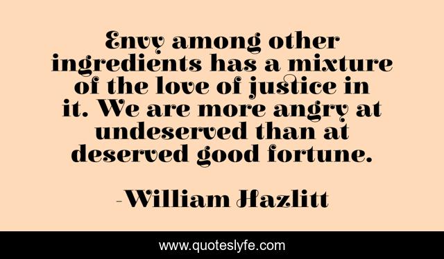This page presents the quote "Envy among other ingredients has a mixture of the love of justice in it. We are more angry at undeserved than at deserved good fortune.". Author of this quote is William Hazlitt. .