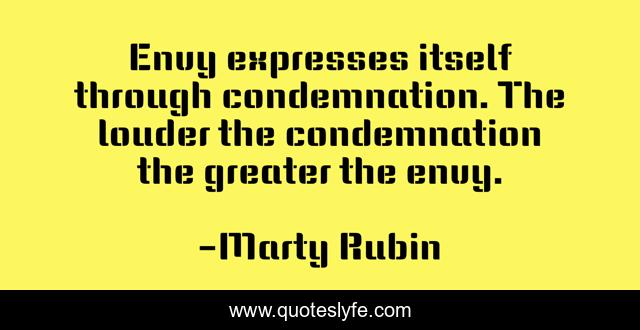 This page presents the quote "Envy expresses itself through condemnation. The louder the condemnation the greater the envy.". Author of this quote is Marty Rubin. This quote is about envy, condemnation, jealousy,.