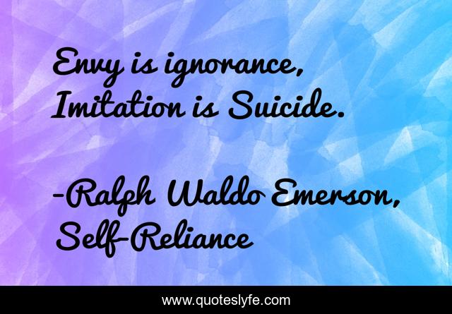 This page presents the quote "Envy is ignorance, Imitation is Suicide.". Author of this quote is Ralph Waldo Emerson, Self-Reliance. This quote is about enthusiasm, inspirational,.