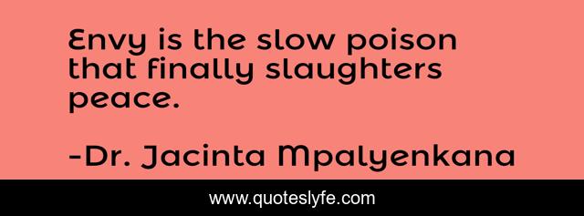 This page presents the quote "Envy is the slow poison that finally slaughters peace.". Author of this quote is Dr. Jacinta Mpalyenkana. This quote is about peace-of-mind, personal-development, happiness,.