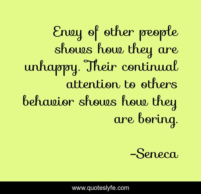 This page presents the quote "Envy of other people shows how they are unhappy. Their continual attention to others behavior shows how they are boring.". Author of this quote is Seneca. This quote is about envy, people, boring, unhapiness, unhappy, boredom,.