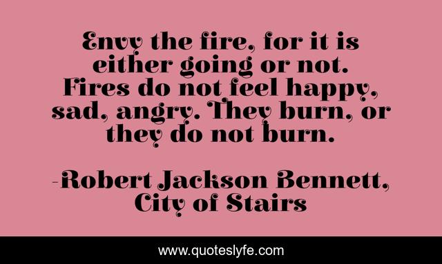 This page presents the quote "Envy the fire, for it is either going or not. Fires do not feel happy, sad, angry. They burn, or they do not burn.". Author of this quote is Robert Jackson Bennett, City of Stairs. This quote is about fire, life, flame,.