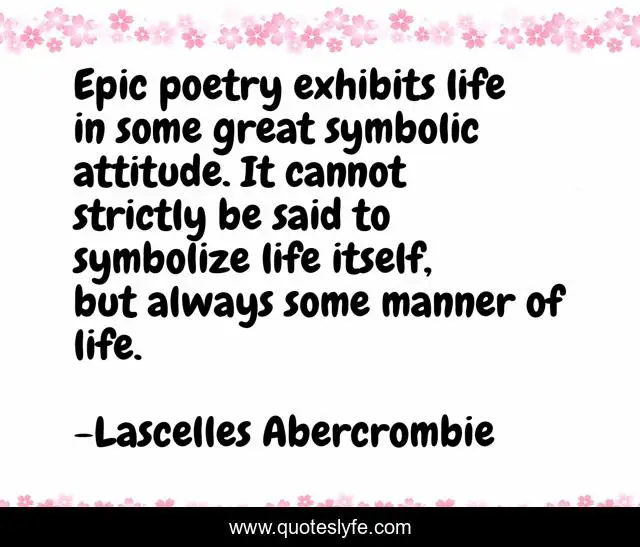 This page presents the quote "Epic poetry exhibits life in some great symbolic attitude. It cannot strictly be said to symbolize life itself, but always some manner of life.". Author of this quote is Lascelles Abercrombie. This quote is about life, great, poetry,.