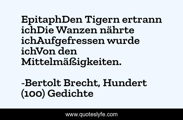 "Bertolt Brecht, Hundert (100) Gedichte Quotes." Quoteslyfe.com, 2025. Mon. 08 Dec. 2025. <https://www.quoteslyfe.com/quote/EpitaphDen-Tigern-ertrann-ichDie-Wanzen-n-hrte-25568>.