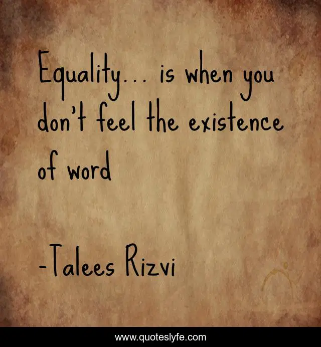 This page presents the quote "Equality... is when you don't feel the existence of word". Author of this quote is Talees Rizvi. This quote is about religious-tolerance, unity-of-all-people, equal-rights, equality, humanity,.