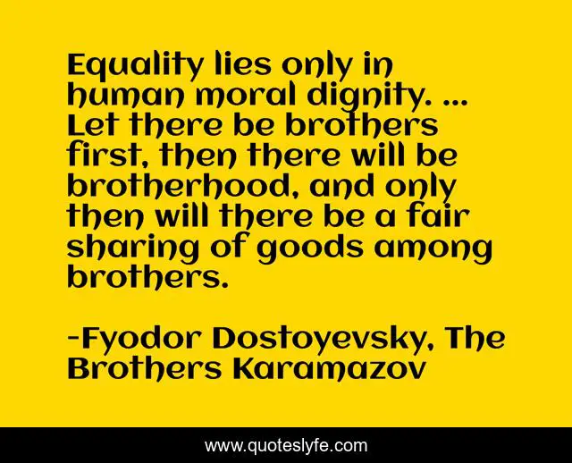 This page presents the quote "Equality lies only in human moral dignity. ... Let there be brothers first, then there will be brotherhood, and only then will there be a fair sharing of goods among brothers.". Author of this quote is Fyodor Dostoyevsky, The Brothers Karamazov. This quote is about dignity, sharing, equality, brotherhood,.