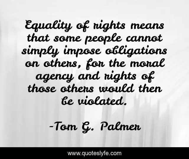 This page presents the quote "Equality of rights means that some people cannot simply impose obligations on others, for the moral agency and rights of those others would then be violated.". Author of this quote is Tom G. Palmer. This quote is about people, moral, rights,.