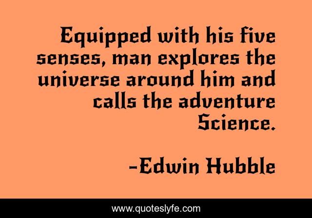 This page presents the quote "Equipped with his five senses, man explores the universe around him and calls the adventure Science.". Author of this quote is Edwin Hubble. This quote is about exploration, inquiry, science,.