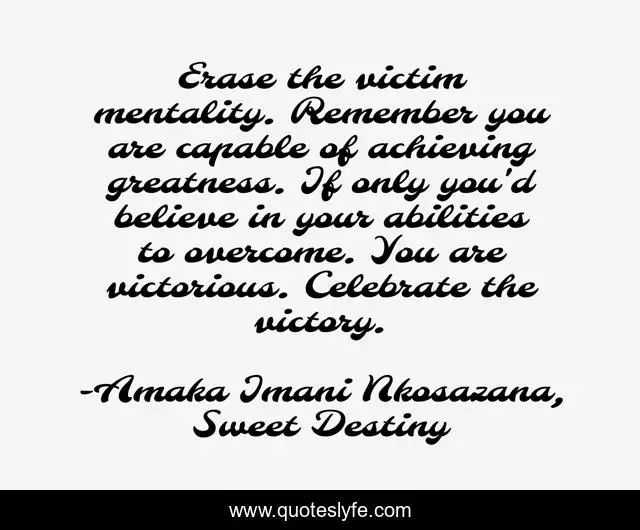"Amaka Imani Nkosazana, Sweet Destiny Quotes." Quoteslyfe.com, 2025. Mon. 08 Dec. 2025. <https://www.quoteslyfe.com/quote/Erase-the-victim-mentality-Remember-you-are-105575>.