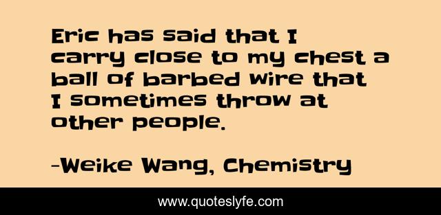 This page presents the quote "Eric has said that I carry close to my chest a ball of barbed wire that I sometimes throw at other people.". Author of this quote is Weike Wang, Chemistry. This quote is about relationships, pain,.