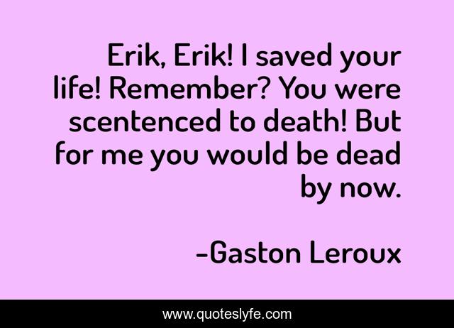 This page presents the quote "Erik, Erik! I saved your life! Remember? You were scentenced to death! But for me you would be dead by now.". Author of this quote is Gaston Leroux. This quote is about the-phantom-of-the-opera, death, le-fantôme-de-l-opéra,.
