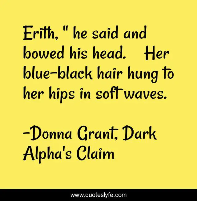 This page presents the quote "Erith, " he said and bowed his head. Her blue-black hair hung to her hips in soft waves.". Author of this quote is Donna Grant, Dark Alpha's Claim. This quote is about death, light-fae, dragon-kings, reaper, dark-fae, dark-kings, paranormal-romance, fae,.